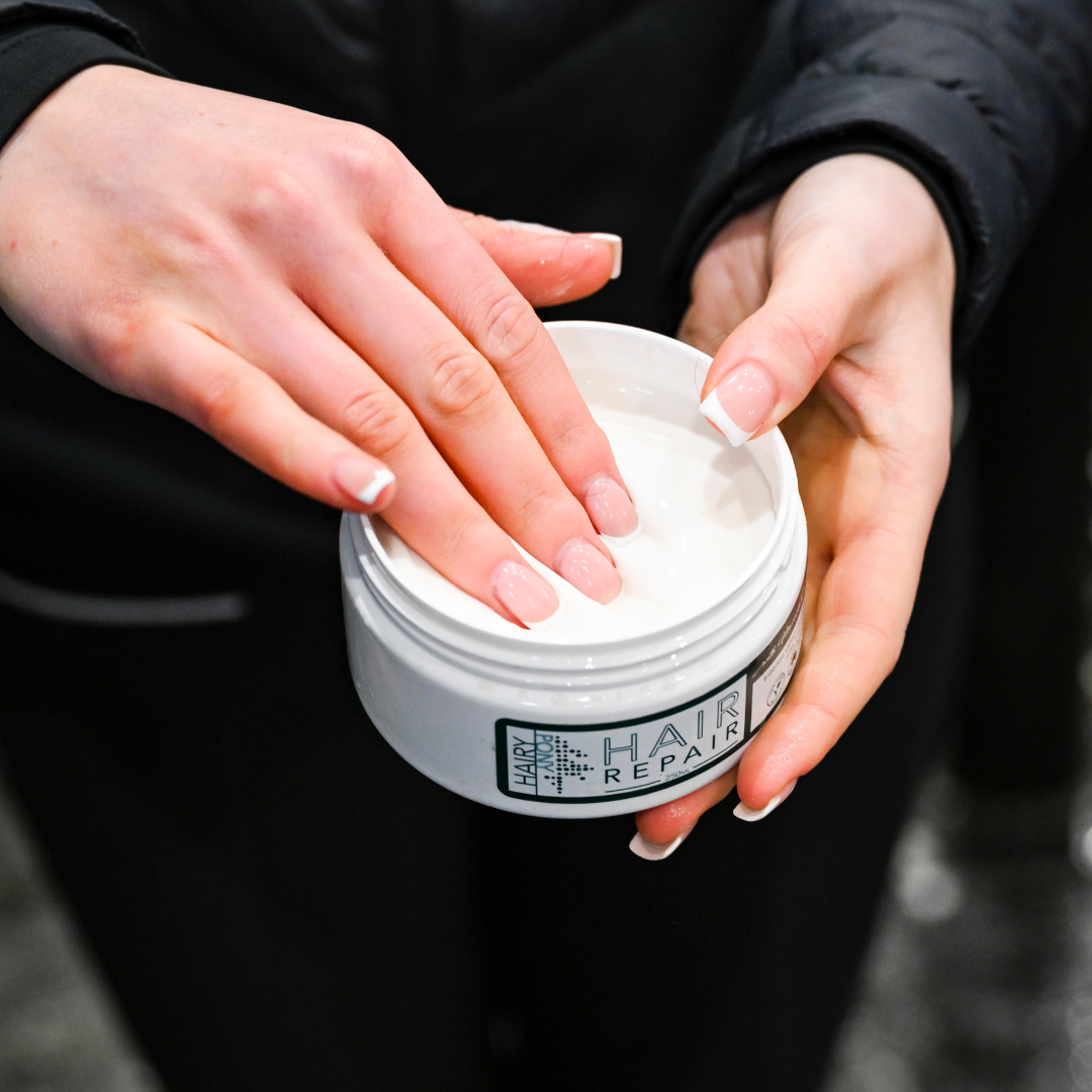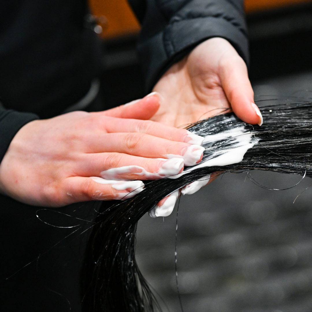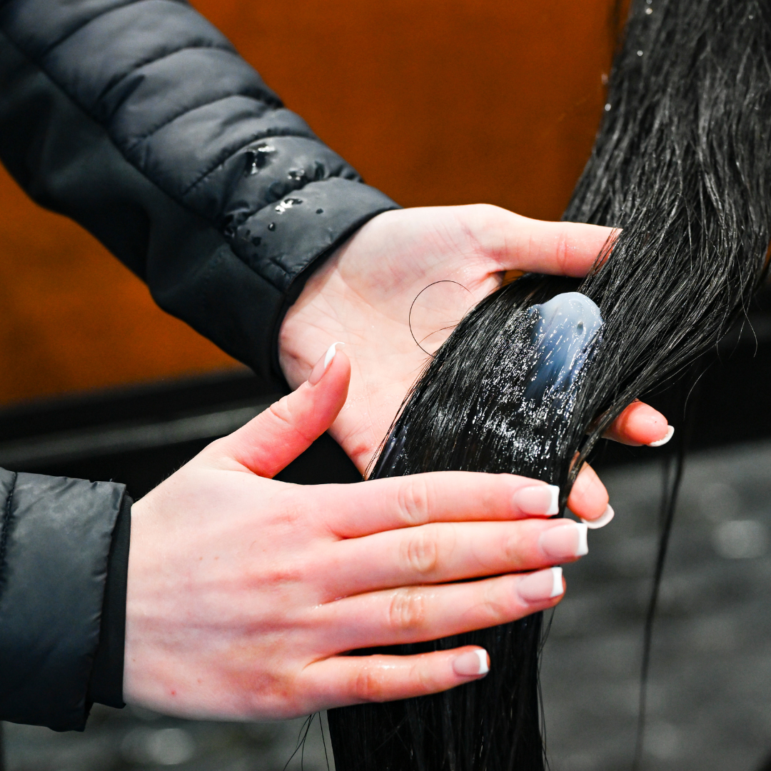 Step Three: Rinse, then apply Hair Repair evenly through the tail.