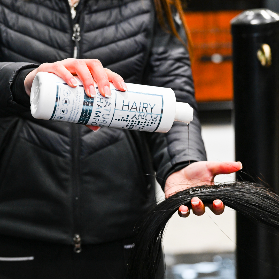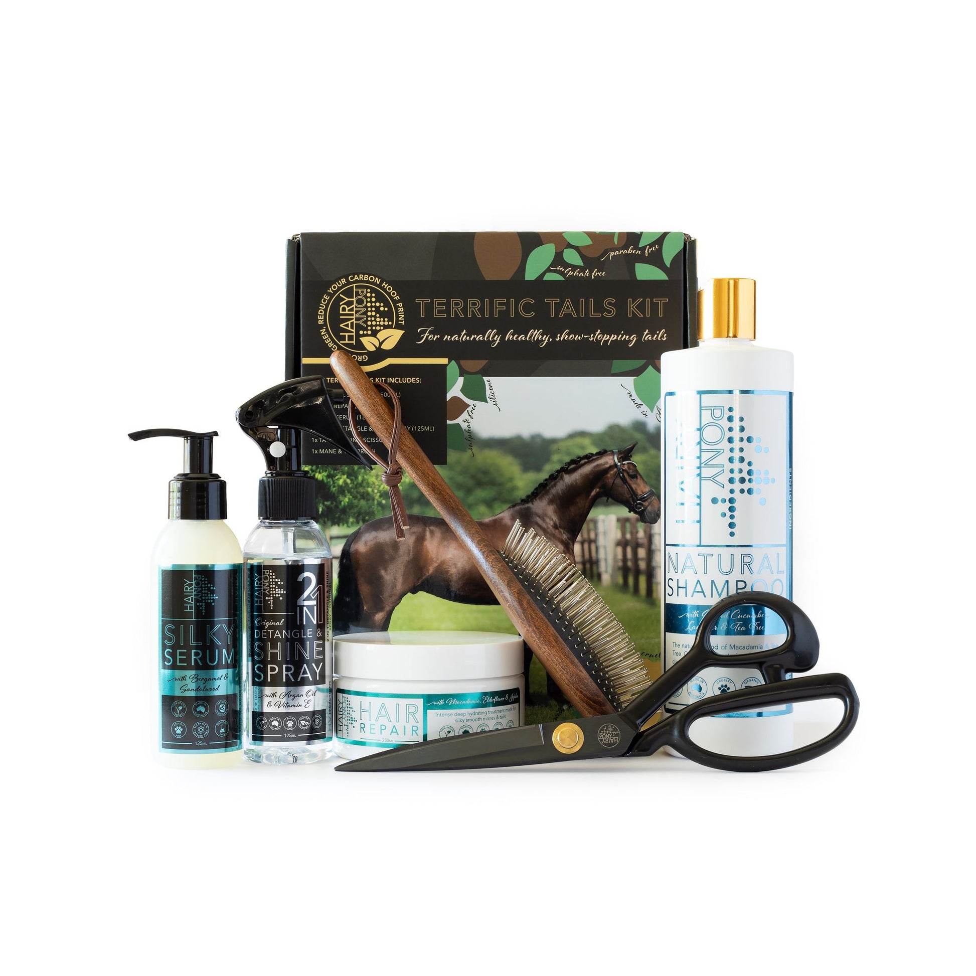 Bring dull, dry or tangled tails back to life with the Hairy Pony Terrific Tails Kit — a luxury all-in-one system designed to cleanse, condition, detangle and perfect. Whether you’re maintaining everyday shine or preparing for the show ring, this beautifully curated kit has everything you need to create healthy, glossy and truly terrific tails.
