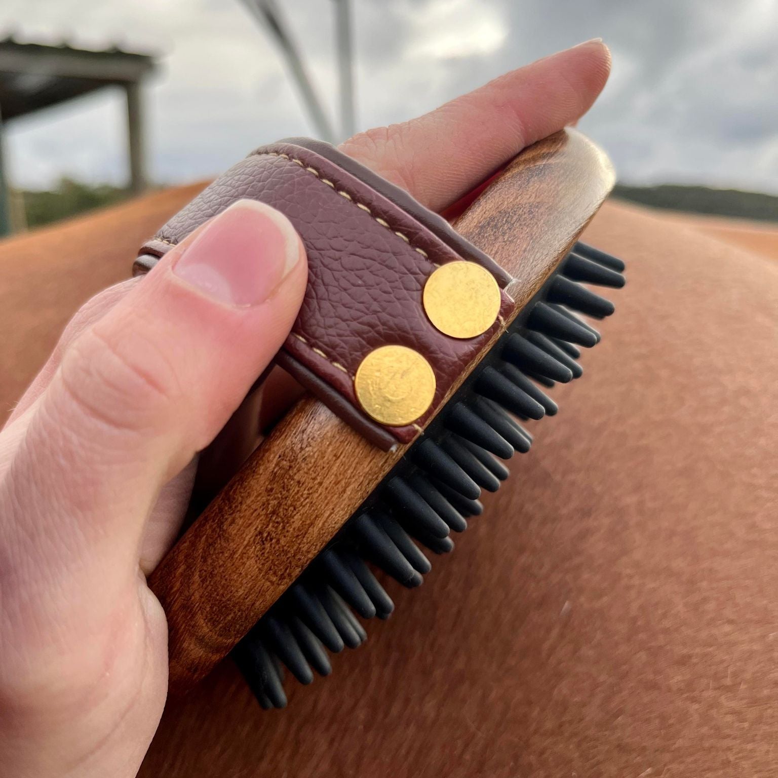 Handcrafted with our signature beechwood, the HAIRY PONY RUBBER BRUSH makes removing shedding hair quick & easy on long and short coats! Loose hairs are gently & efficiently removed with durable yet flexible rubber bristles that grab on to the coat whilst massaging the horse. The HAIRY PONY RUBBER BRUSH is finished with a comfortable paddle handle & beautiful gold details - another timeless addition to your grooming collection.