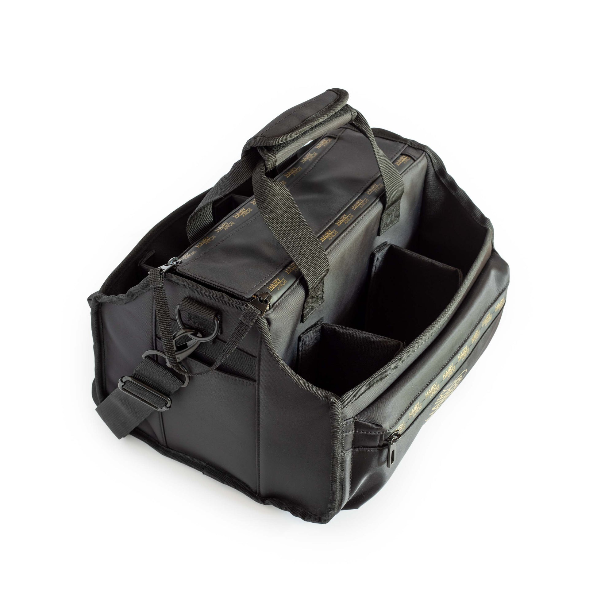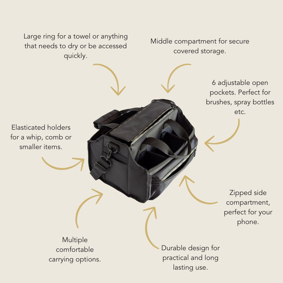 This spacious caddy offers ample room and customisable compartments, ensuring every brush, spray bottle, and comb has a designated spot – perfect for competitions, grooming at home or general storage. Thoughtfully designed, it features elasticated whip holders and a ring for hanging spurs, bits, or towels, keeping items dry and within reach.